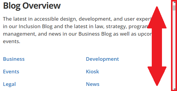 Content should wrap onto new lines so that it always fits in the browser window. This is called content that ‘reflows.’ When content doesn’t reflow, it typically overflows the page, requiring an added scrollbar to become visible. A website that has both vertical and horizontal scrollbars requires more effort and the larger the screen magnification, the more serious the problem.