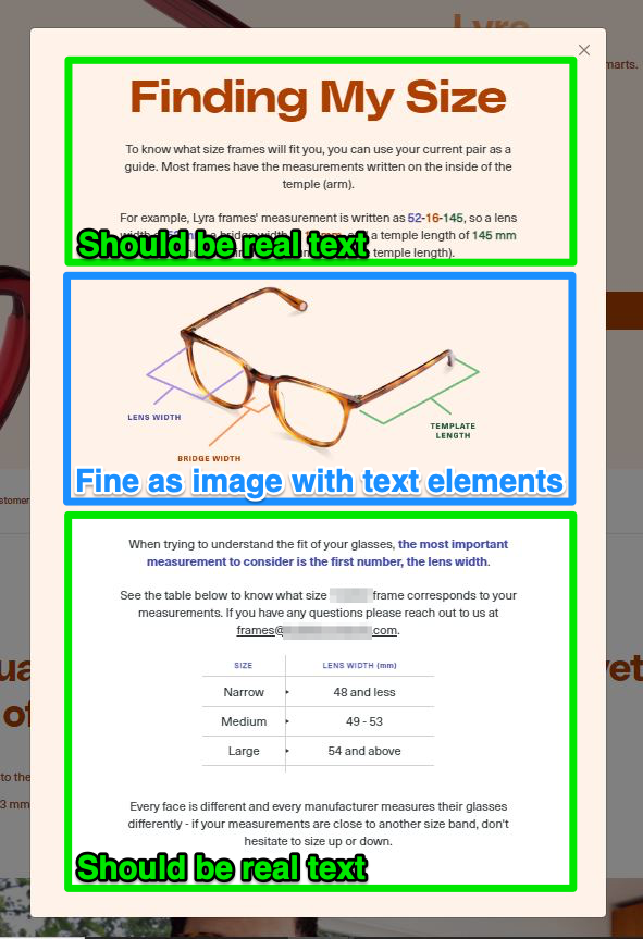 The use of images of text has, I would suggest, become less of an issue over time as the power of CSS to style and position text elements has gained ever more power. But it’s still something that we run into from time-to-time. There are some examples where you might be able to make the case that a skilled HTML/CSS person could recreate what is presented in an image pretty much perfectly. But you must also ask the question about how this might put the visual layout at risk once we’ve factored in the extra flexibility of font size changes, text spacing and so on. While this is all well and good, such changes can potentially break what is an important layout. Wherever you can, push for real text. And wherever that may not be possible, at the very least push for an SVG over a bitmap image.