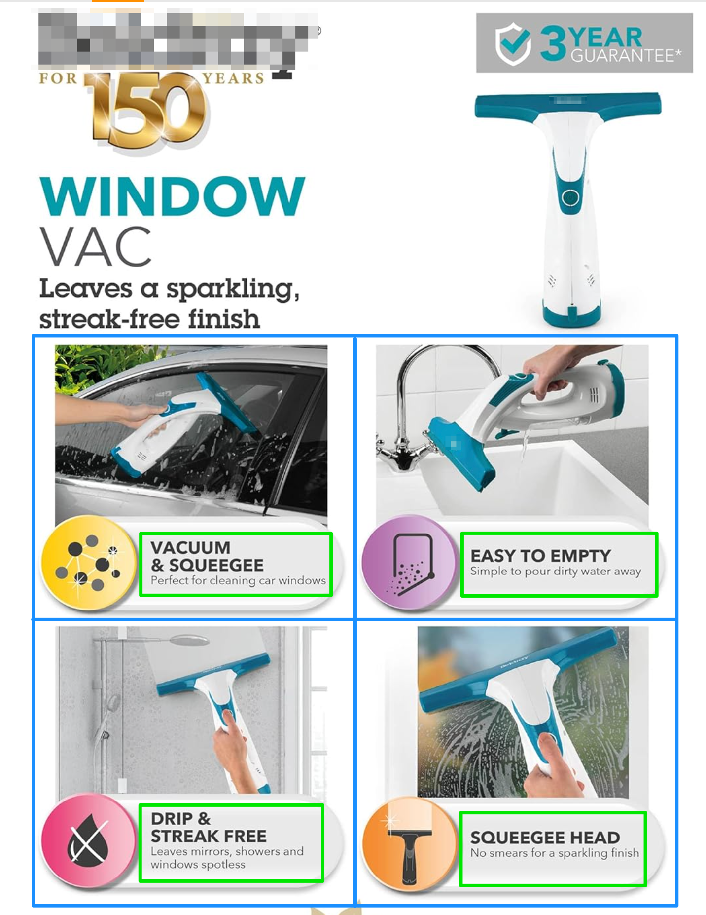What do we have here? Some advertising bumph for the features of a window vac. You see this kind of thing on many an ecommerce site, typically because the site doesn’t provide vendors using the site with any real way to do anything too creative. It’s probably a case of “You can upload some images … and that’s it!” so we end up with batches of images that can be, at times, text-heavy. Is this a pass or fail? Surely this one’s easy peasy, window squeegey?