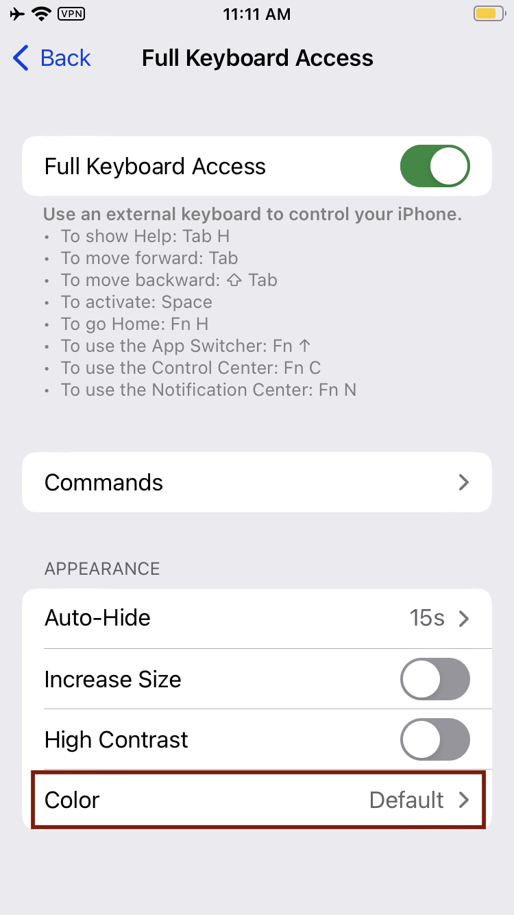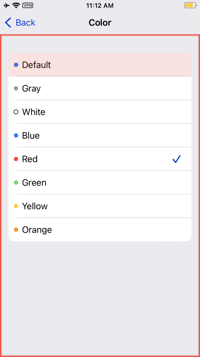 Tip: Another way to test this case is by changing iOS’s default focus indicator color in the Settings app (similar to the macOS option to change accent colors). After that change, if you see that color in use for focus indicators, that tells you that you’re looking at the default focus indicator styling. On the other hand, if a given focus indicator’s color doesn’t change, then that’s a custom focus indicator.