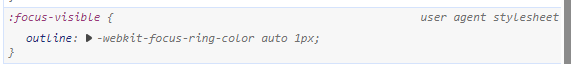 Tip: You can check the default focus indicator styling in Chrome’s developer tools by searching for “: focus-visible” and finding the “user agent stylesheet”.