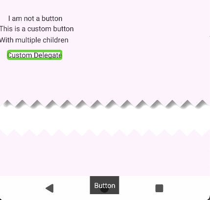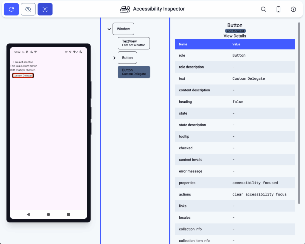 This causes the TextView to now be identified as a Button, and we can verify this with an accessibility inspector. The view is just a single view — with no children and a text property of “Custom delegate” — which is what we created in the XML, aside from the role that we just overrode in the Java file.