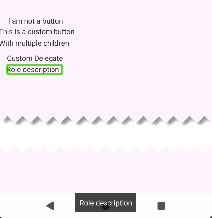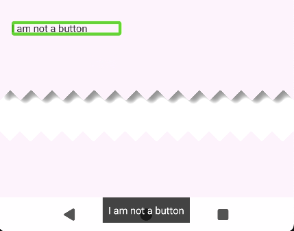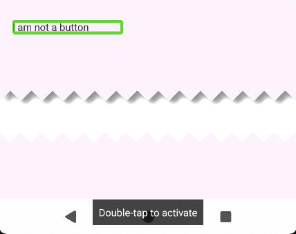 As the image above shows, the onClick doesn’t do anything, but TalkBack will announce this as “I am not a button. Double tap to activate” because there is an OnClickListener provided. Users should not have to rely on the “Double tap to activate” announcement to provide any concrete information on the role.