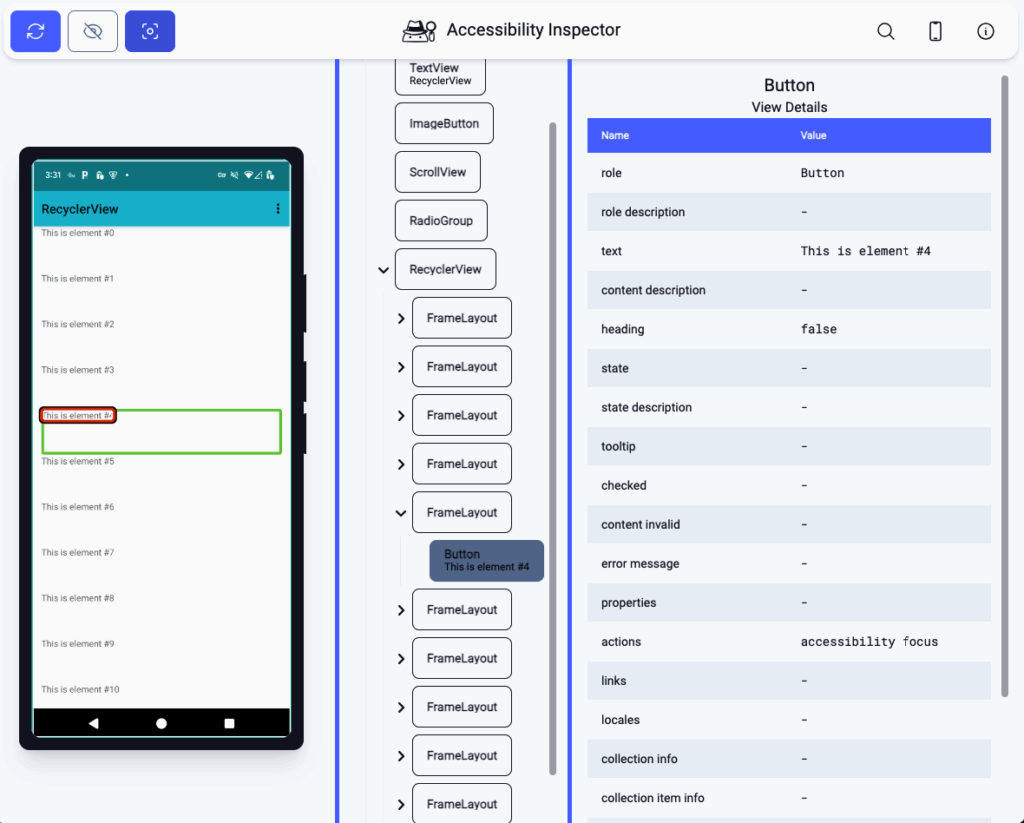 The output of this is similar to the previous examples except the RecyclerView adds list semantics. So on top of announcing as a “Button”, it also announces the index of the button in the list.