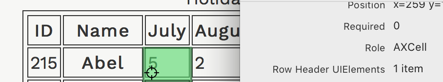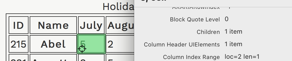 A partial view of the accessibility tree for a table, without scope attributes, with offset column of row headers shows that both column headers and row headers are exposed correctly. The same information is exposed as the example table with the scope attributes.