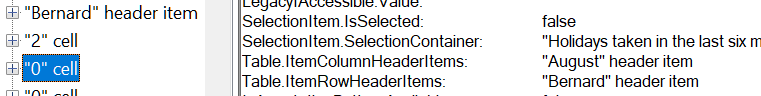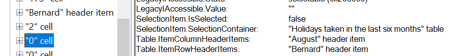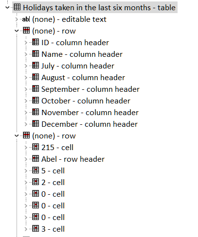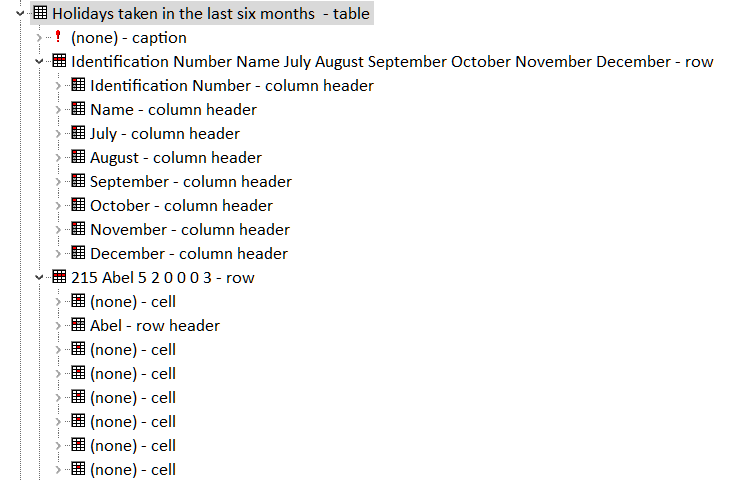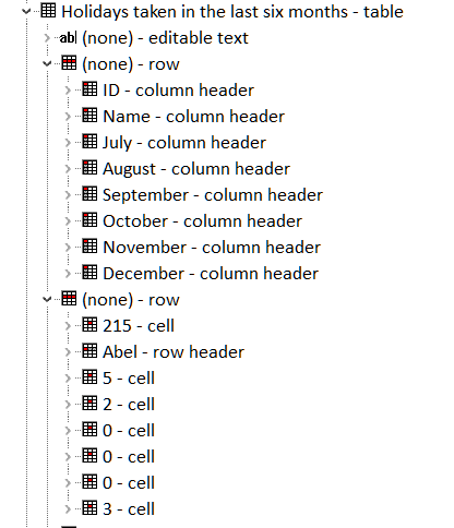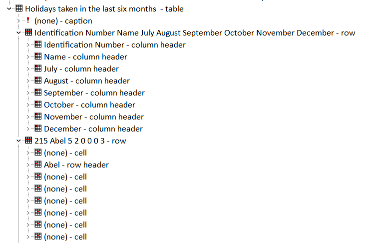 A partial view of the accessibility tree (in Edge) for a table, without scope attributes, with offset column of row headers shows that both column headers and row headers are exposed correctly. The same information is exposed as the example table with the scope attributes.