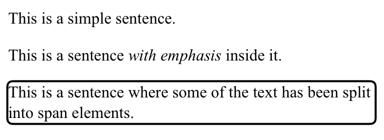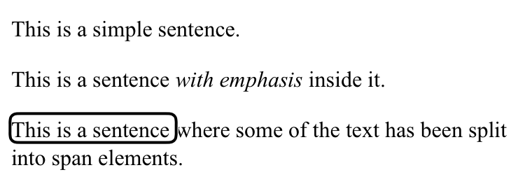 <p role="text">This is a sentence <span>where some of the text</span> has been <span>split into span elements</span>.</p>