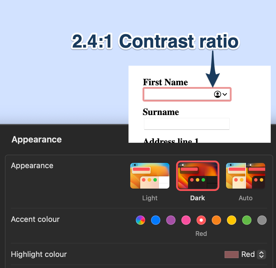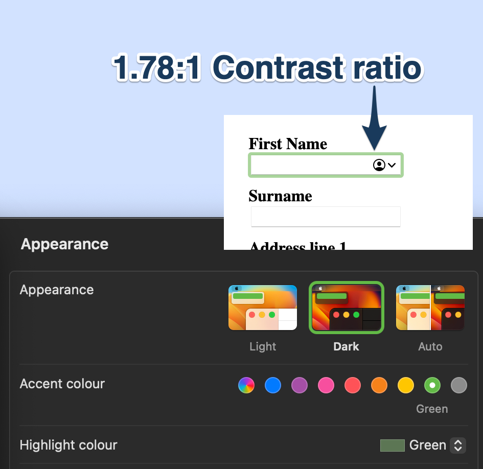 - If you were to apply a custom style for the border and it’s under the 3:1 contrast ratio, then you will have failed 1.4.11 (ironically, even if you actually improved the default slightly—I’m looking at you again, Safari—you will notch up a failure).