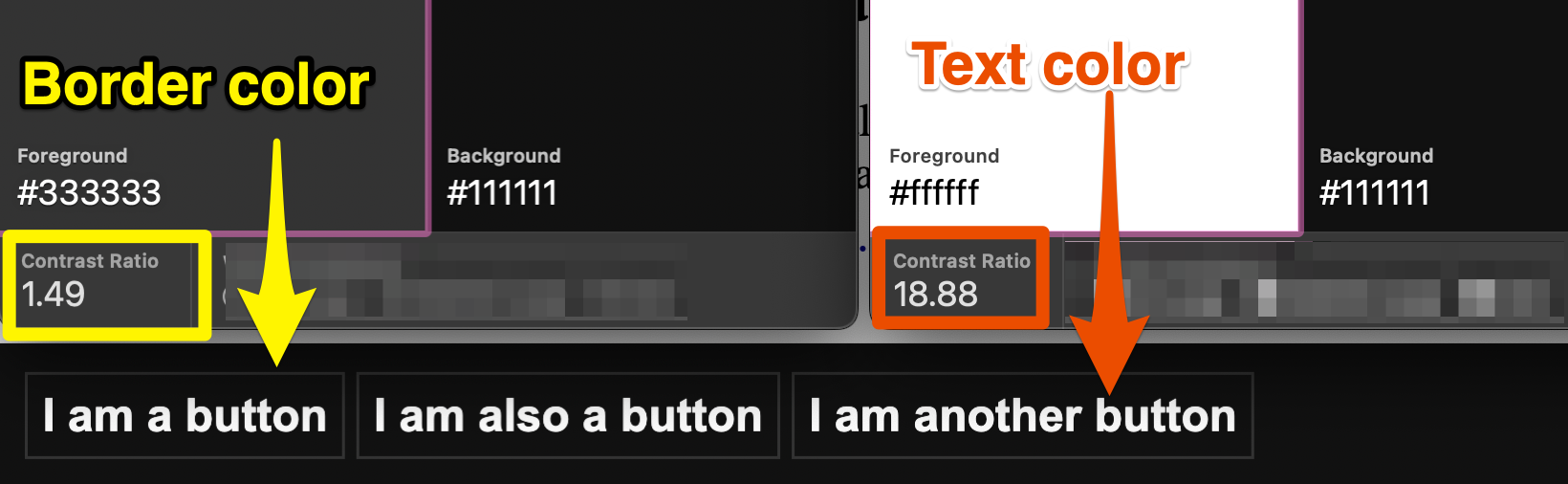 - The border color? Well, there is no border here. The button background (#000) has very low contrast with the page background (#222) of just 1.32:1. But the button boundary is not really the issue here.
