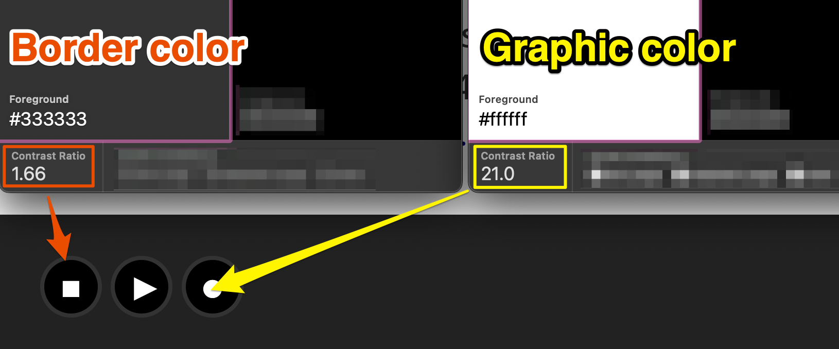 - The actual control graphic—the stop, play, or record symbol—is white against either a completely black background inside the button (21:1 contrast ratio) or if you compare to the background outside the button boundary it’s a 15.91:1 contrast ratio. Whatever you measure it against, the symbols are easy to perceive.