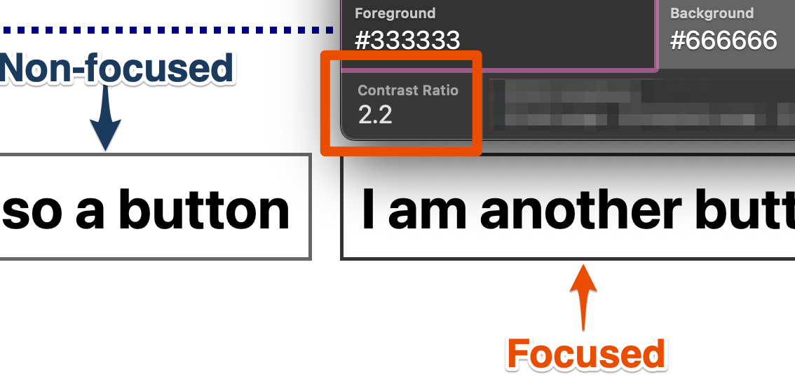 - The reason it fails 1.4.11 is not because of the barely perceptible change of border color from default to focus, but because a custom focus indicator has been provided that has low contrast against the button background. If this dashed border were changed from black to, say, bright yellow, that would offer good contrast on focus and would pass.